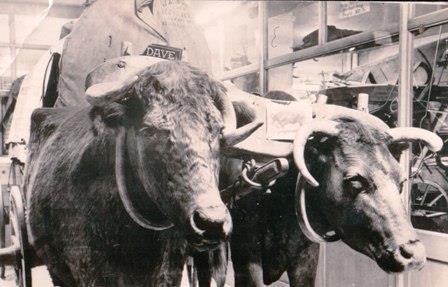 Meeker's oxen, shown here as preserved in later years, gave visitors a sample ride in a covered wagon. They were seen on the streets of Seattle, and in the years after the fair pulled his wagon on reenactment trips on the Oregon trail.