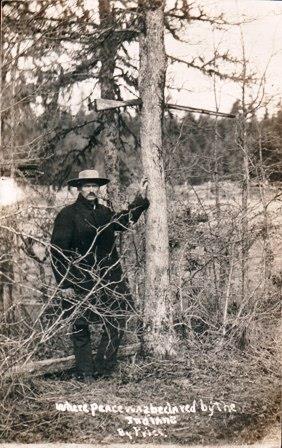 Note the gun in the tree in this photograph by the Thurston County photographer Stanton Price. That the tree has grown around the gun over a period of several years seems certain, although the story of its origins has been questioned by some. Meeker - who had been present and active during the period of Native American conflict with settlers - displayed a portion of the trunk containing the gun as one of the many fascinating artifacts that must have been part of his display of Northwest history.