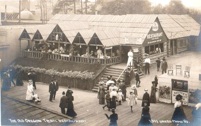 Oregon Trail Restaurant at the AYPE. The front building is based on the architecture of an early roadhouse in Oregon, while the back part may represent part of a pioneer farm.
