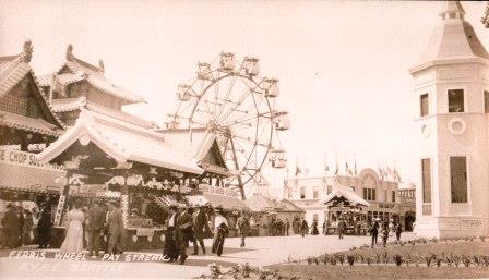 In this photo postcard Pay Streak image published by an unknown photographer, Nowell's studio is the two-story building in the background, to the right of the Ferris Wheel. The Chinese Village is in the left foreground, with the Swedish building in the right foreground. This image was taken from approximately the middle of the present Astronomy-Physics building on the UW campus, looking north.