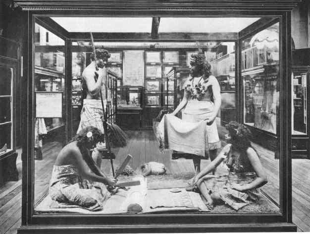 Smithsonian Samoan Family exhibit in the Government Building. Ref This was accompanied by photographs, paintings, objects and text describing life in Guam and the Marianas. There were exhibits such as this for many groups including Philippine islanders, Hawaiians, and Eskimos. Southwestern American native groups were shown, sometimes in both ancient and current life, as in the case of the Pueblos.